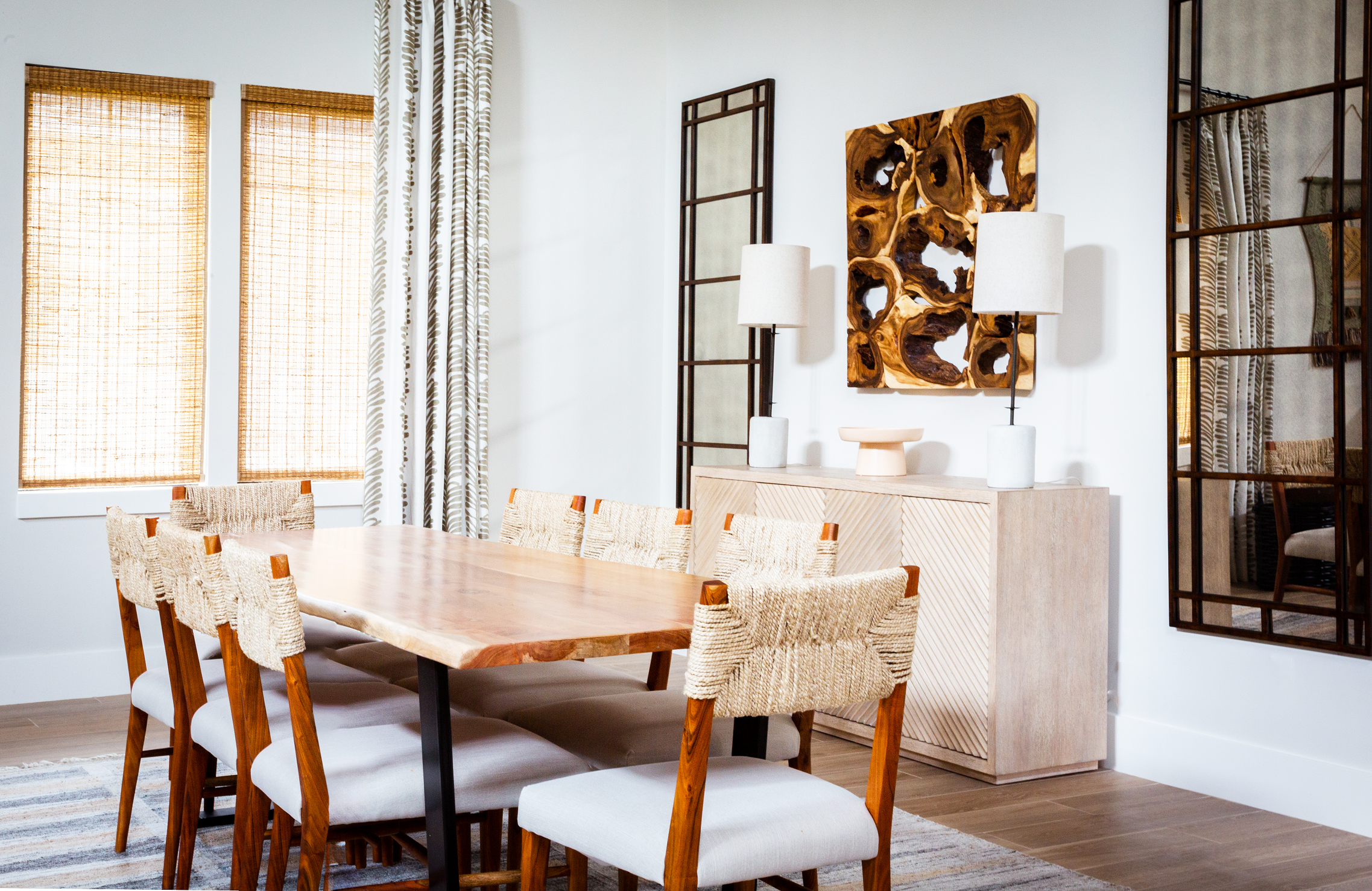 In the dining room, every element contributes to the design narrative. A natural wood slab table serves as the focal point, complemented by woven chairs and a 100% wool rug, all chosen to imbue the space with organic texture. The window treatments feature woven wood shades and drapery adorned with a sophisticated striped leaf pattern.
